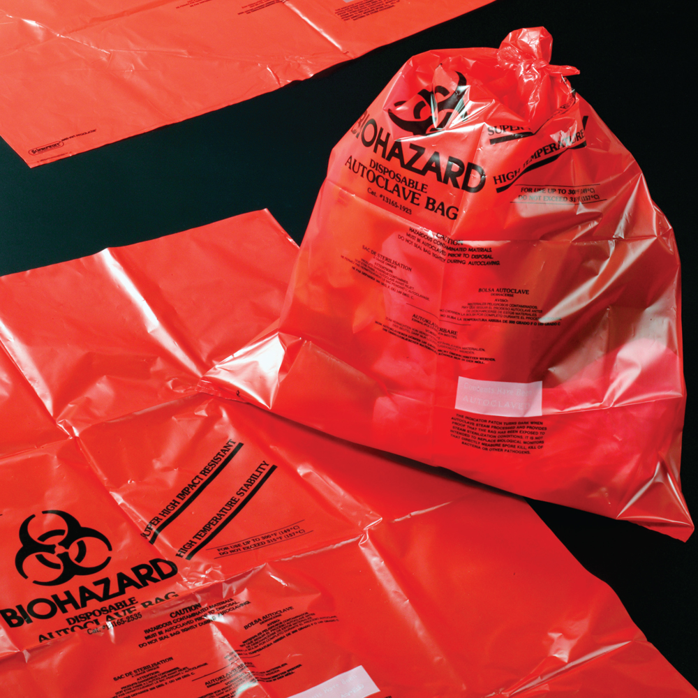 Heavy duty, high impact biohazard bags made of a 0.055 mm thick high molecular weight polypropylene blend.