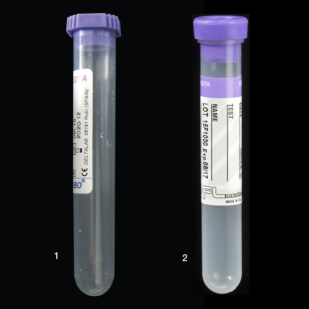 Tubes made of clear polypropylene, supplied capped and labeled. Mauve, pierceable (but not pierced) and plugged cap made of thermoplastic rubber.