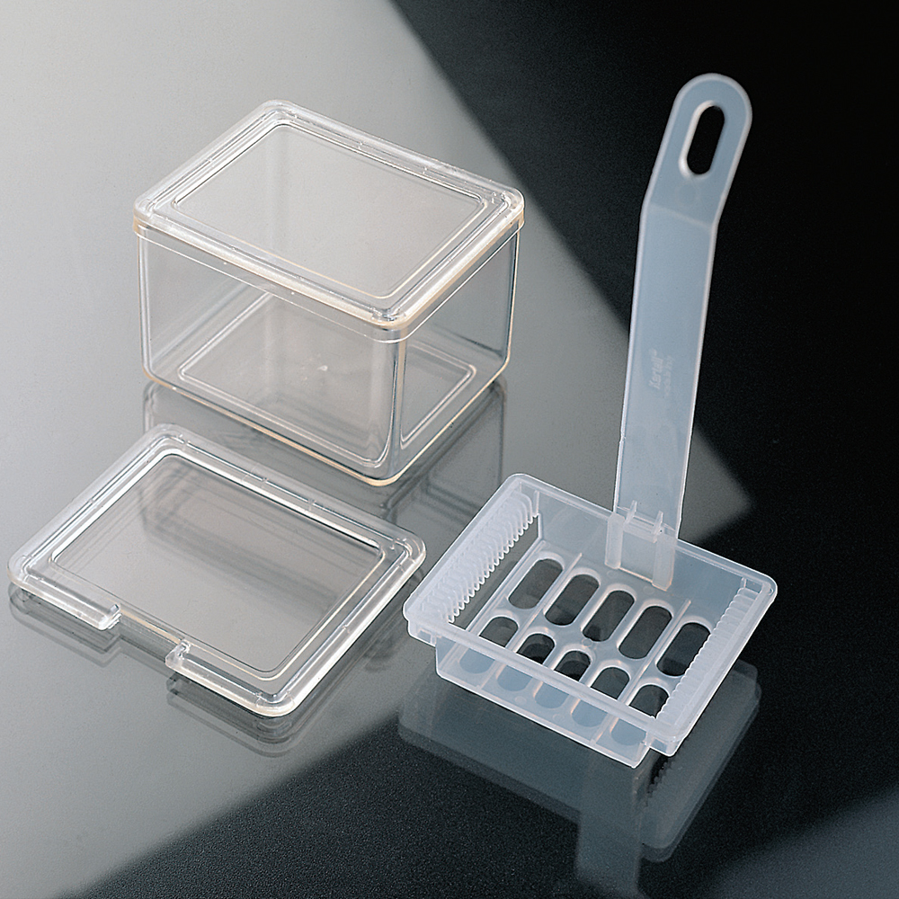 Dish made of polypropylene and jar made of autoclavable TPX. The jar is supplied with two lids. The first lid provides evaporation free storage of staining liquid when the dish is not in use. The second includes a slot to allow staining dish insertion.